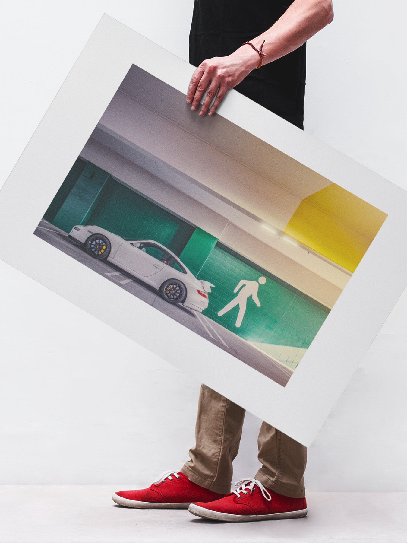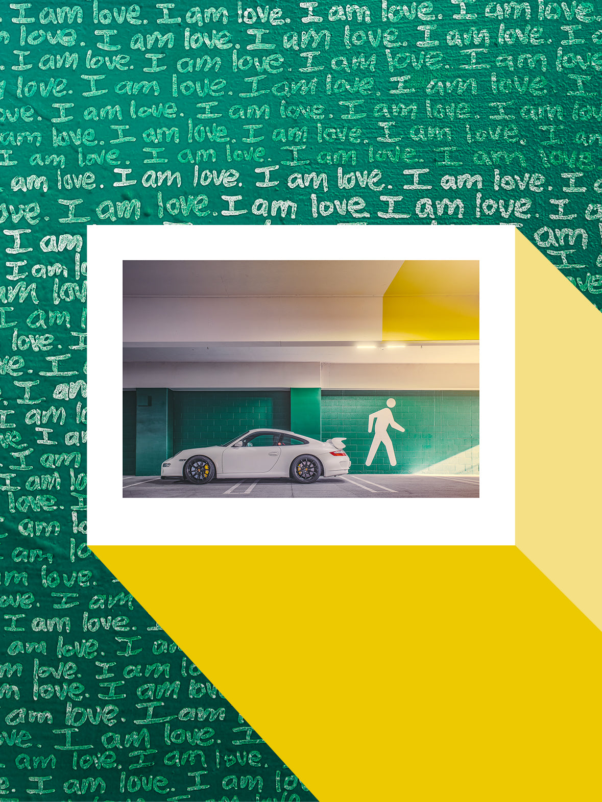 My old 997 GT3 against a green wall accented by a yellow splash. Previously titled "Modern Analog" during the test run, I changed it to Mezger Walkman due to the icon on the wall. A great tribute to my watercooled days.