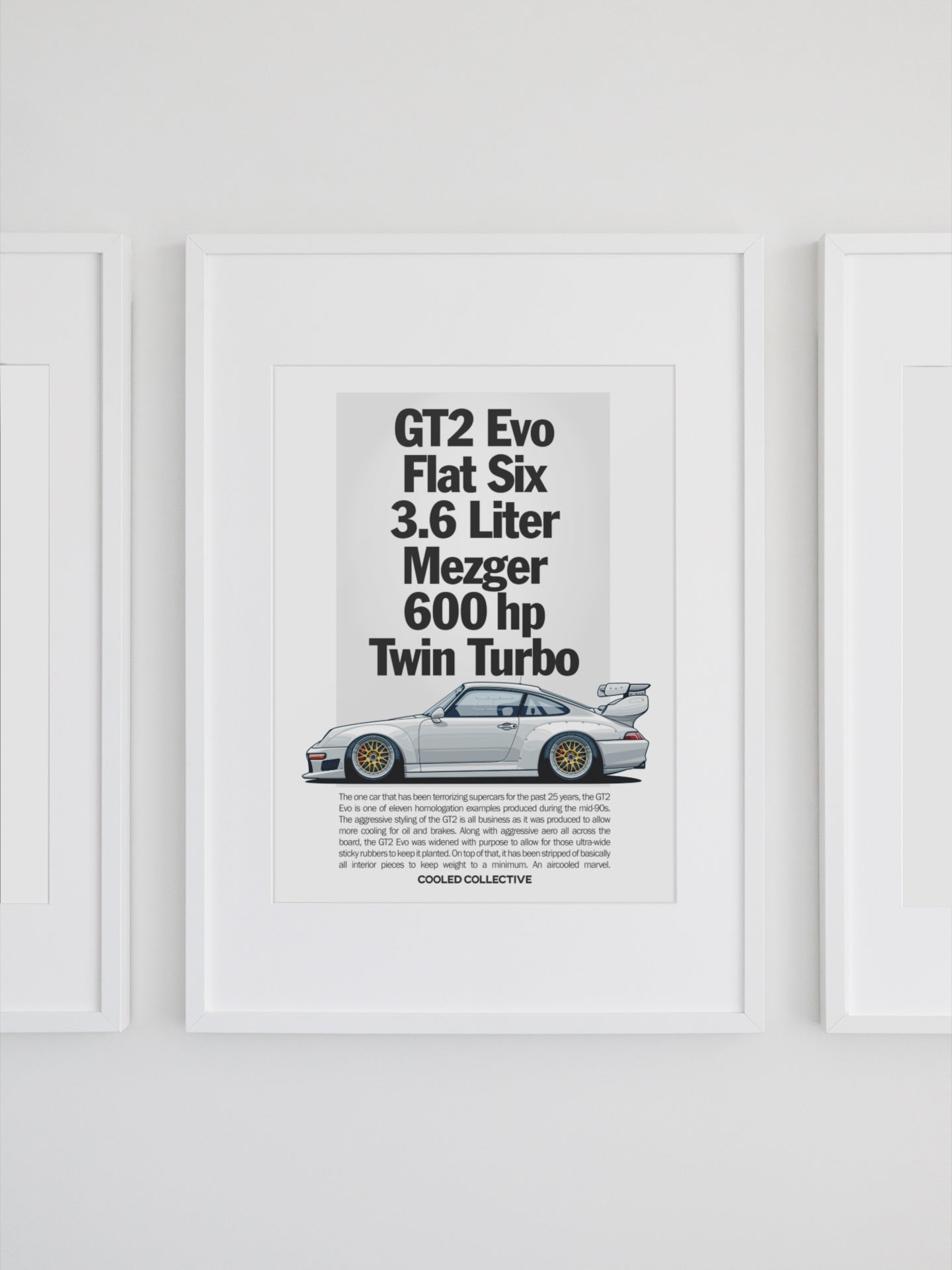 The aircooled beast to rule over all of them, the GT2 Evo was the OG in the line of GT2 monsters. This one was widened in every segment from larger inlets to body and wheels it to give it the ultimate in grip racing. Proudly hang this one up in your favorite room today.