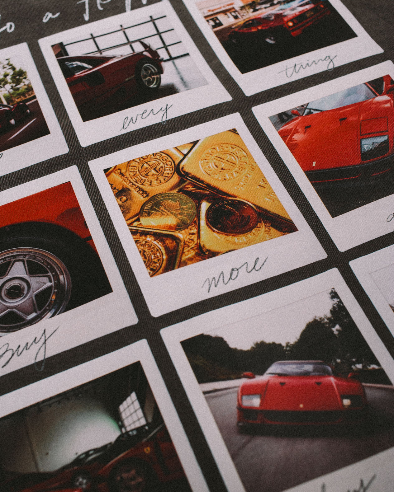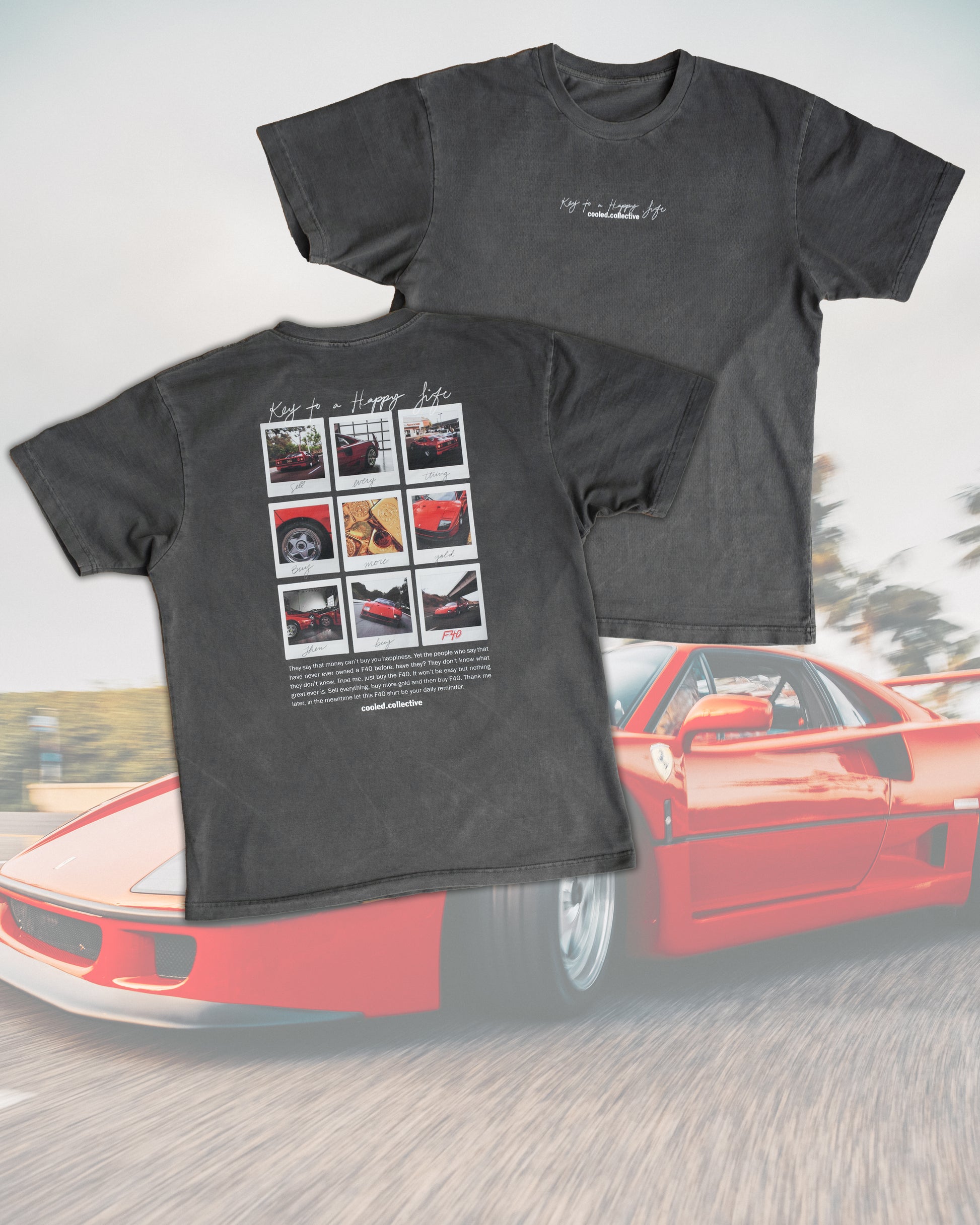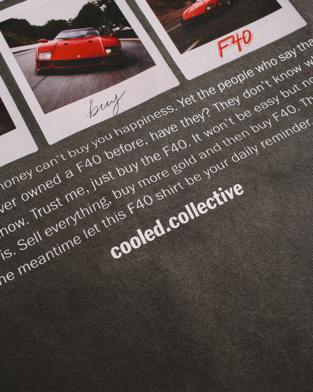 The Icon of the 80s, the F40 captured on 80s Polaroid medium. I have put together a design that shows you how to afford your very own F40. Sell everything, buy gold and then buy F40. Simple formula to a better tomorrow. If that is too hard, then at least you can get this heavyweight shirt to feel better about yourself like the rest of us who don't have F40.